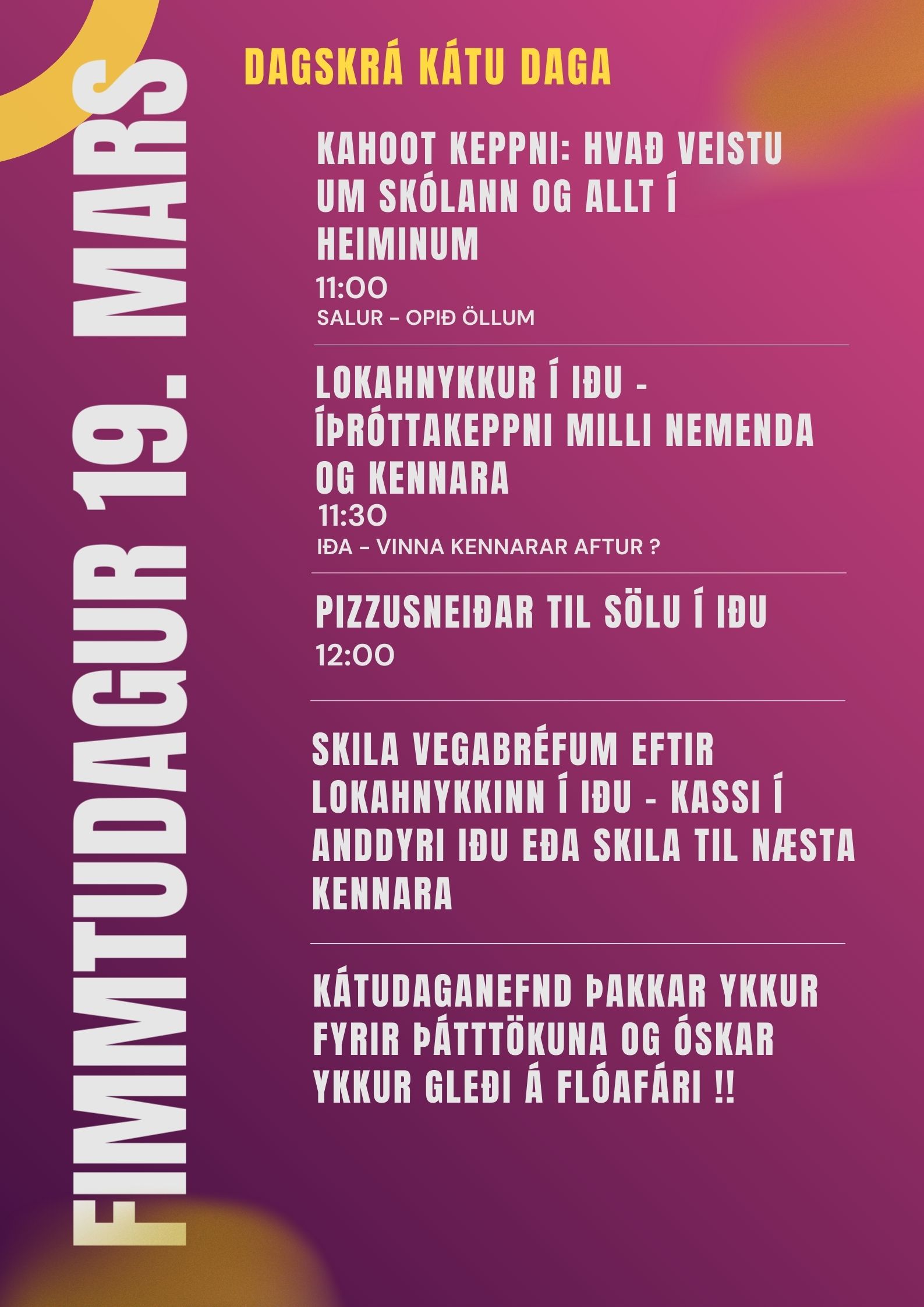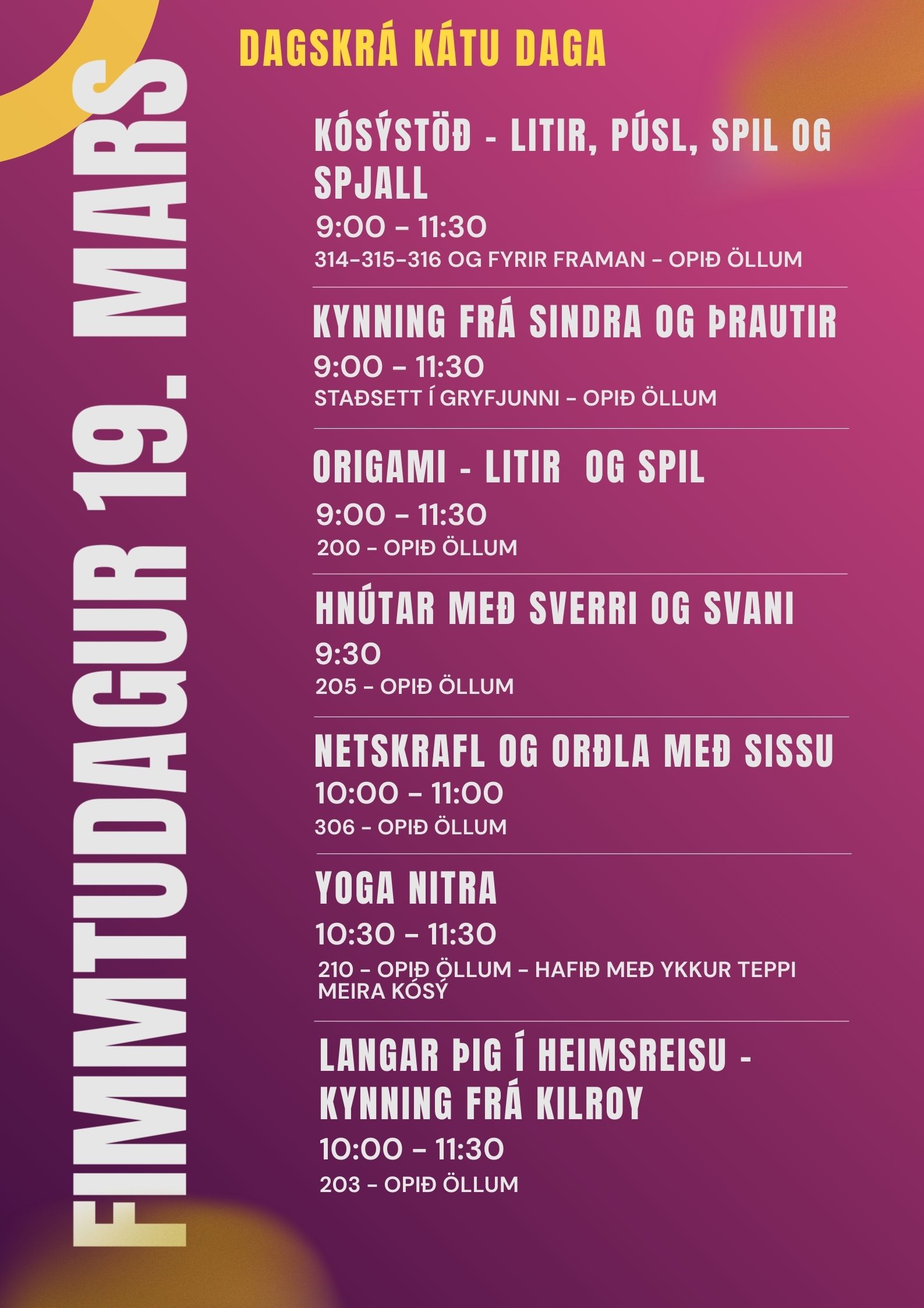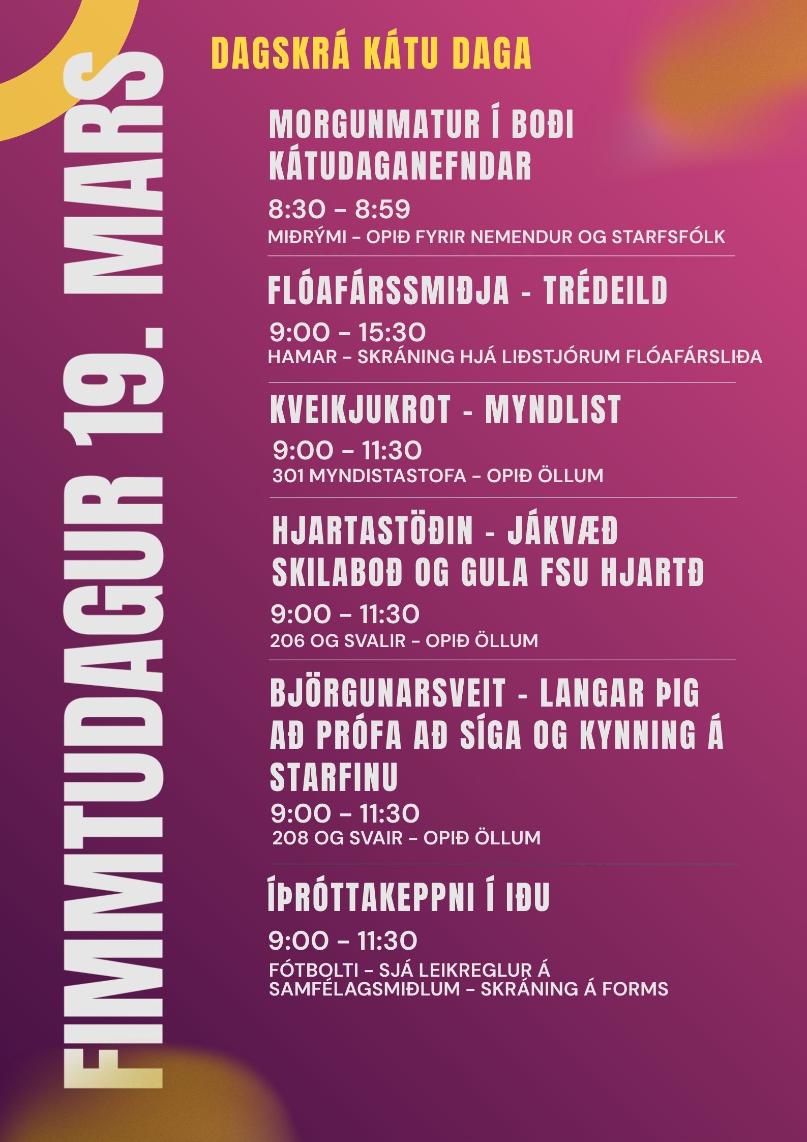Dagskrá fimmtudagsins byrjar á ókeypis morgunverði fyrir öll í miðrými skólans kl. 08:30 og svo hefjast dagskrárliðir kl. 09:00 og standa til kl. 11:30 þegar lokahnykkur Kátra daga byrjar í Iðu og stendur hann til ca kl. 12:10.