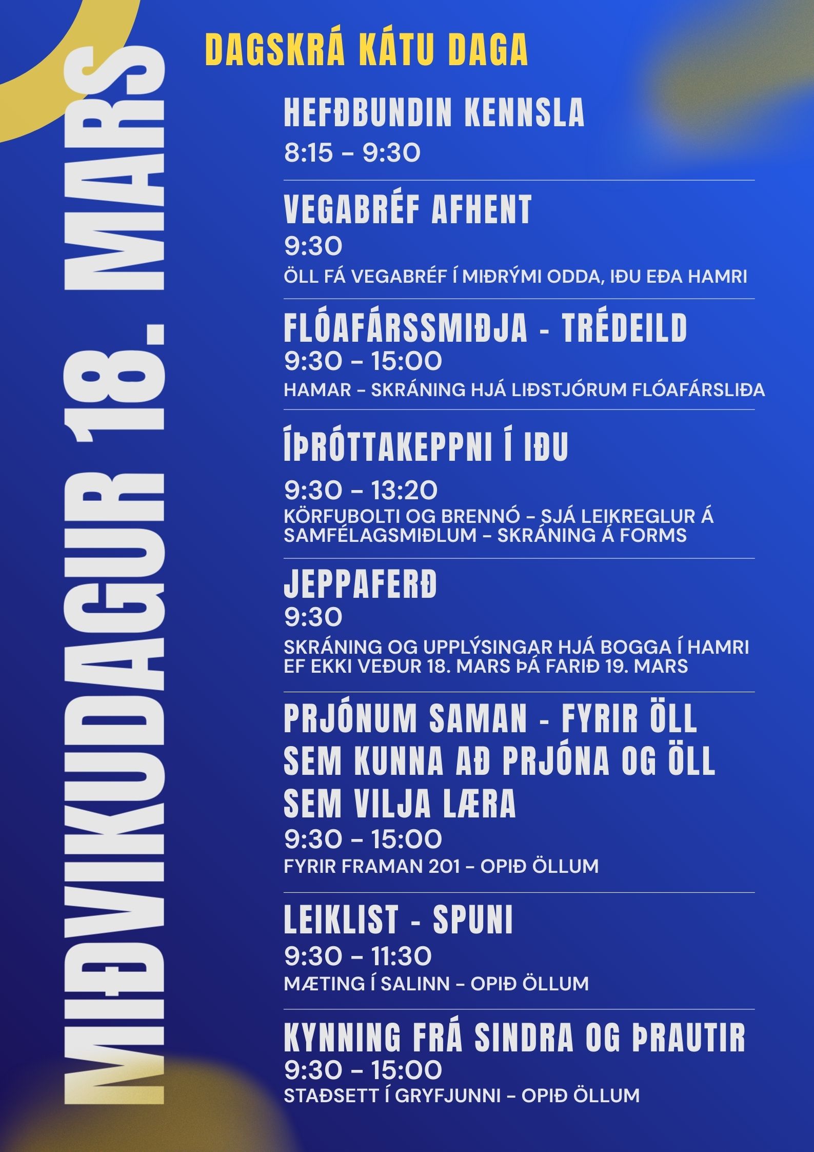 Á miðvikudeginum er hefðbundin kennsla samkvæmt stundaskrá til kl. 09:30.