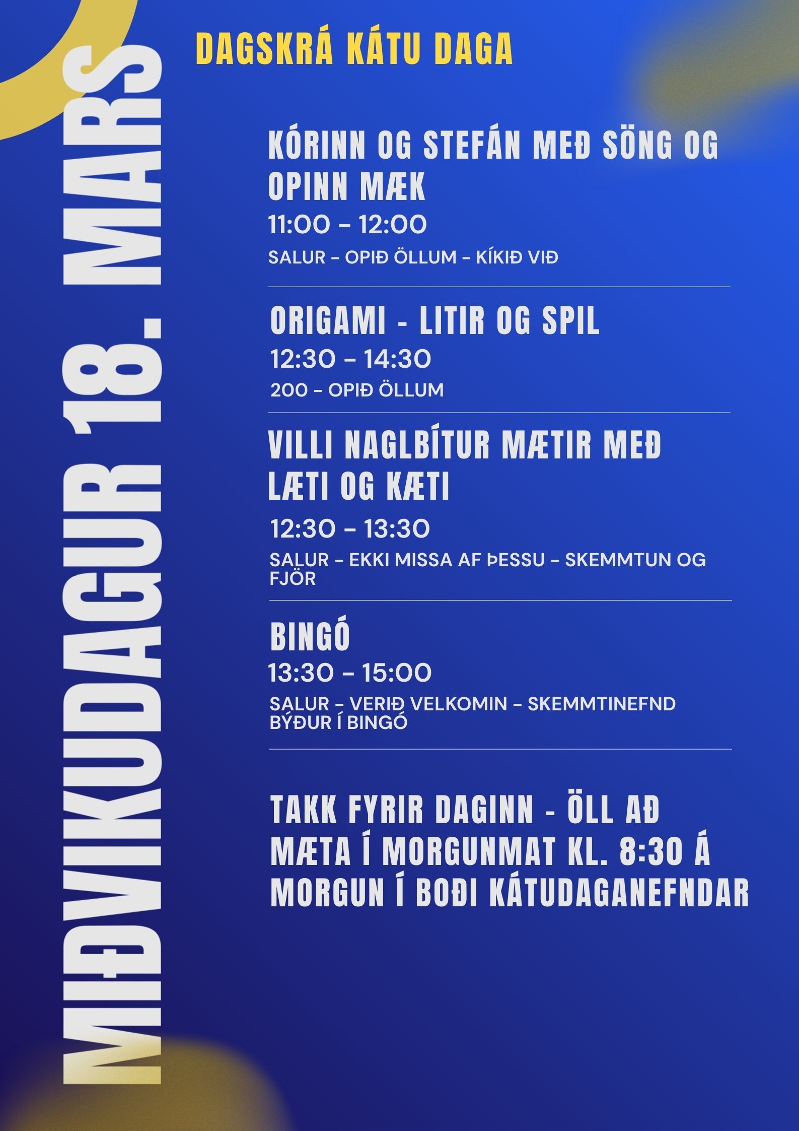 Kl. 09:30 tekur dagskrá Kátu daga við og stendur hún til kl. 15:00 á miðvikudeginum.
