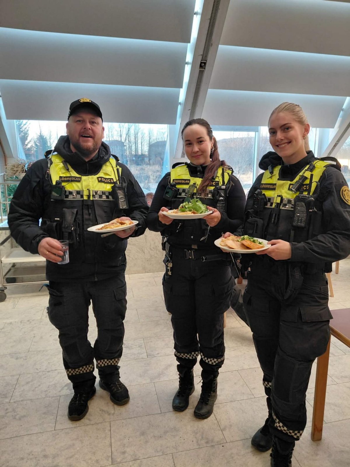 Í leikskólum er það Lúlli löggubangsi sem birtist börnunum en á grunn- og framhaldsskólastiginu eru það svokallaðar löggur í löns sem heimsækja nemendur þegar þeir snæða hádegisverð. Þessi glaðhlakkalega ljósmynd var tekin um miðjan janúarmánuð af þremur löggum í löns í mötuneyti Fjölbrautaskóla Suðurlands þar sem þeir snæddu dýrindis kjúklingabringur og ræddu við nemendur skólans.