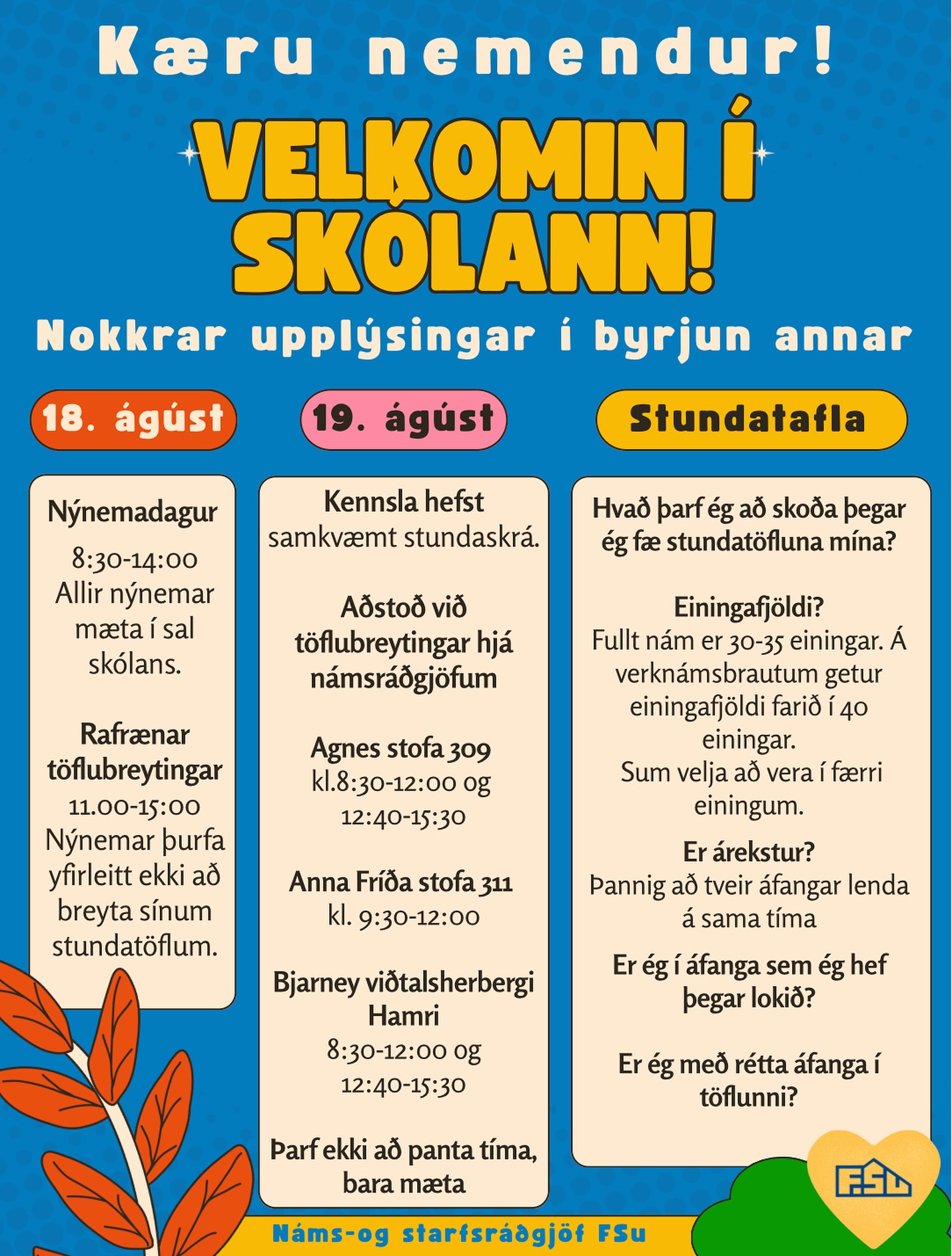Hér er myndræn framsetning á dagskránni og viðtalstímar námsráðgjafa FSu:
