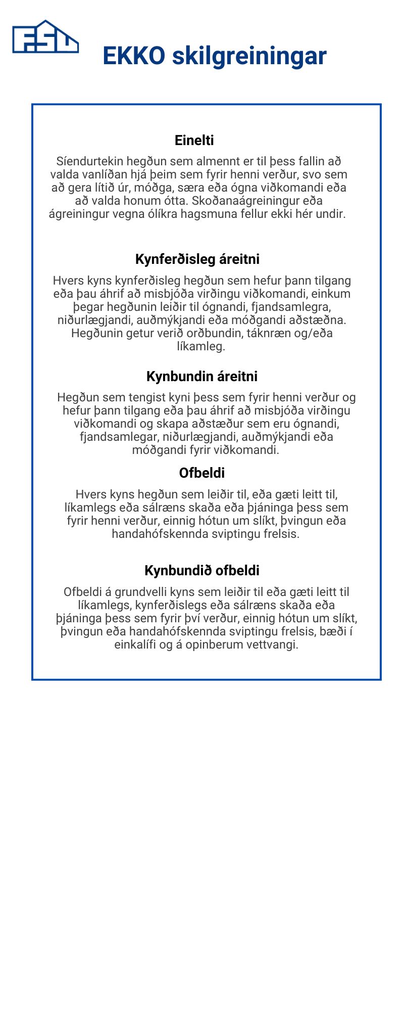 Í EKKO áætlun FSu er samheitið EKKO notað yfir einelti, kynferðislega áreitni, kynbundna áreitni, ofbeldi og kynbundið ofbeldi. Þessi orðnotkun er viðurkennd í umfjöllun um þessi mál og má m.a. finna eftirfarandi skilgreiningar í jafnréttislögum nr. 150/2020.